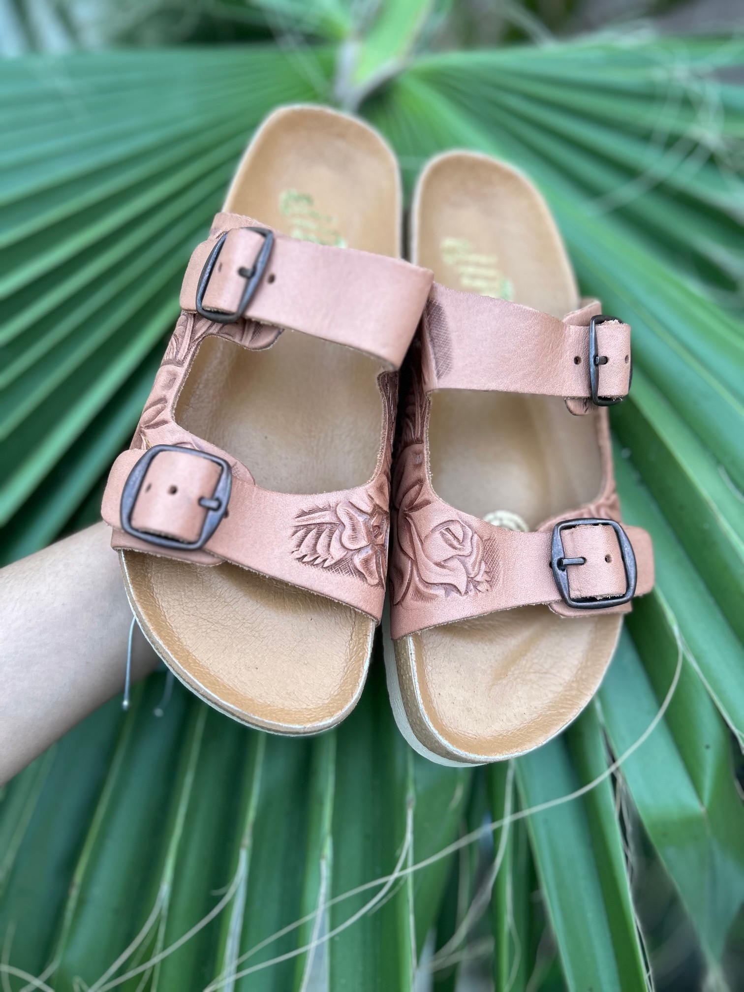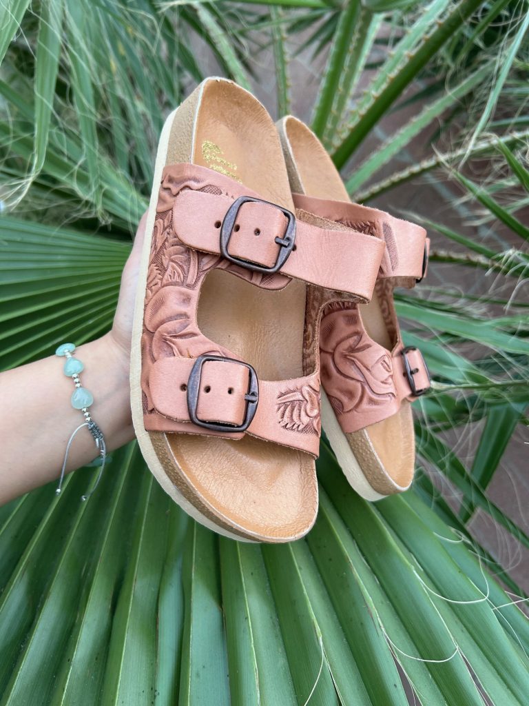 Skip to contentHand tooled Huarache Slides Tan
