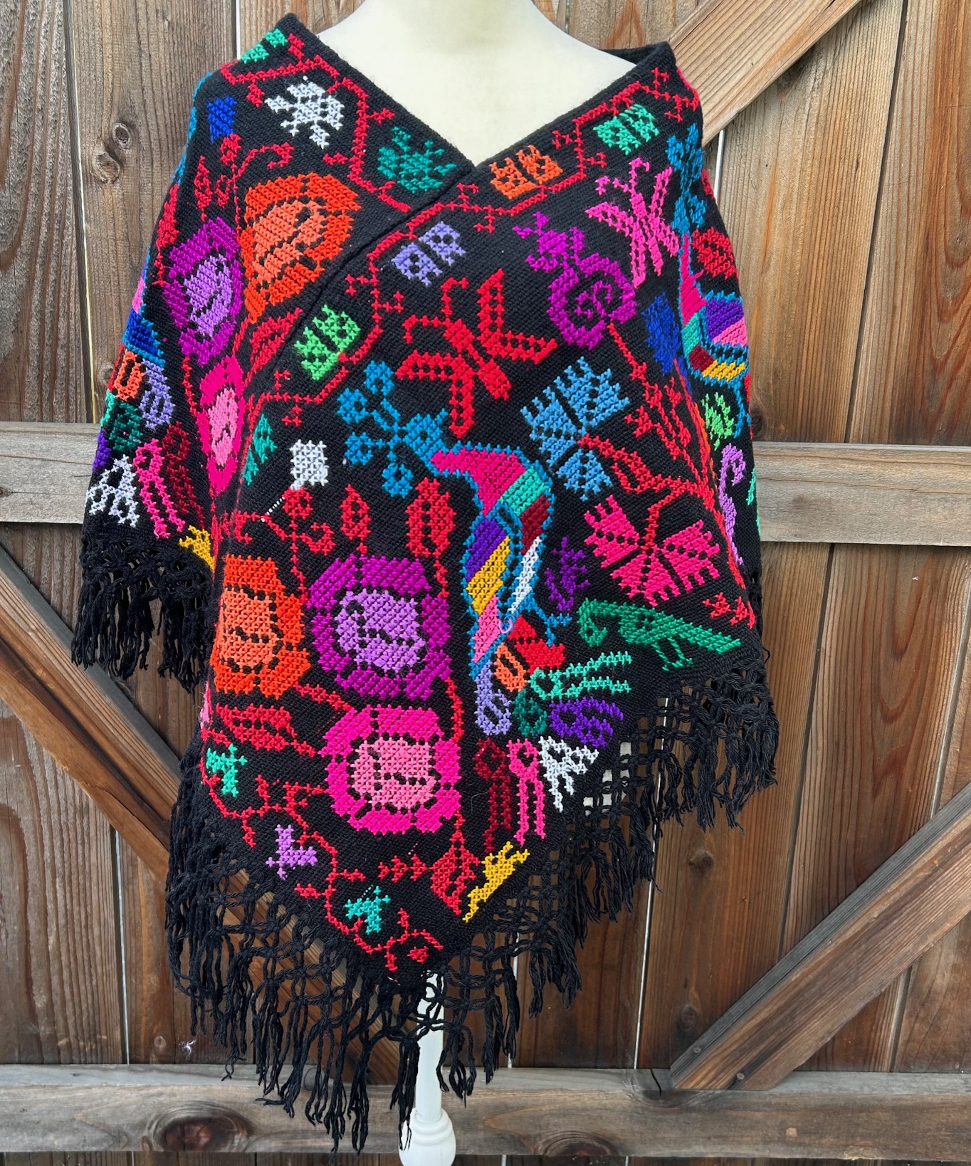 This poncho is completely hand embroidered by cross stitch and handmade on a loom by Mexican Artisans in  Mexico.